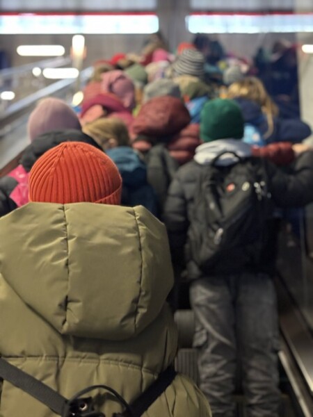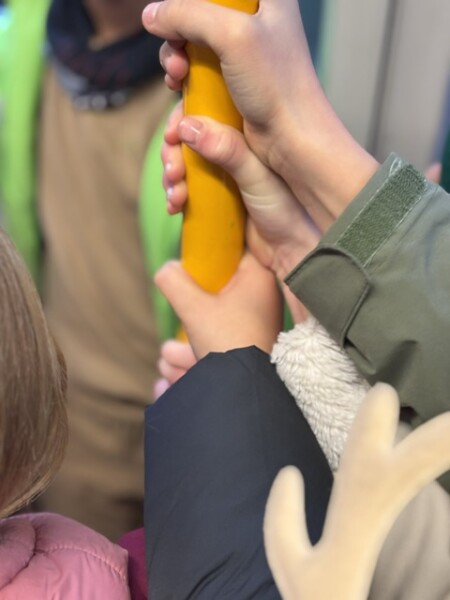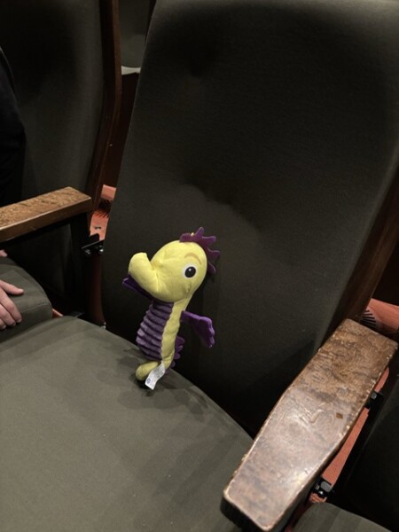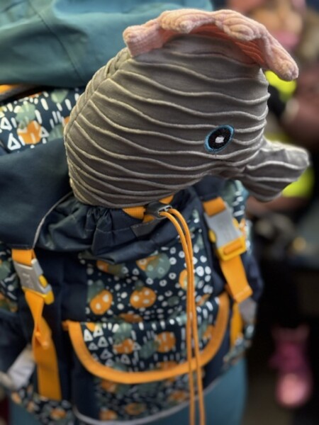 Emil im Doppelpack: Am 27. November 2025 besuchte die Seepferdchen-Klasse das Düsseldorfer Schauspielhaus zum jährlichen Theaterbesuch und sah „Emil und die drei Zwillinge“ – die actionreiche Fortsetzung zu „Emil und die Detektive“ aus dem Vorjahr. Unser Klassenmaskottchen heißt passenderweise auch Emil. Da er zu groß für den Ausflug war, blieb unser Emil daher mit Sternchen in der Klasse zurück, während alle kleineren Seepferdchen-Stofftiere natürlich mitkamen. Die Hinfahrt mit der Bahn war abenteuerlich: Ausfälle und Verspätungen hielten uns auf Trab, doch pünktlich mit unserer Patenklasse (den Kraken) kamen wir als erste Gruppe an und sicherten Plätze in den ersten beiden Reihen für besten Bühnenblick.